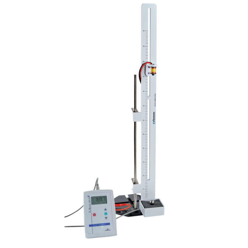 On retrouve ainsi la traditionnelle potence (à fixer sur un statif non fourni) équipée d’un électroaimant maintenant la bille en acier. Cet électroaimant est piloté par un boîtier de commande qui joue également le rôle de chronomètre. Aucune fourche optique n’est nécessaire puisque le chronomètre se déclenche lorsque la bille quitte l’électroaimant et s’arrête lorsque la bille entre en contact avec le bac de réception.