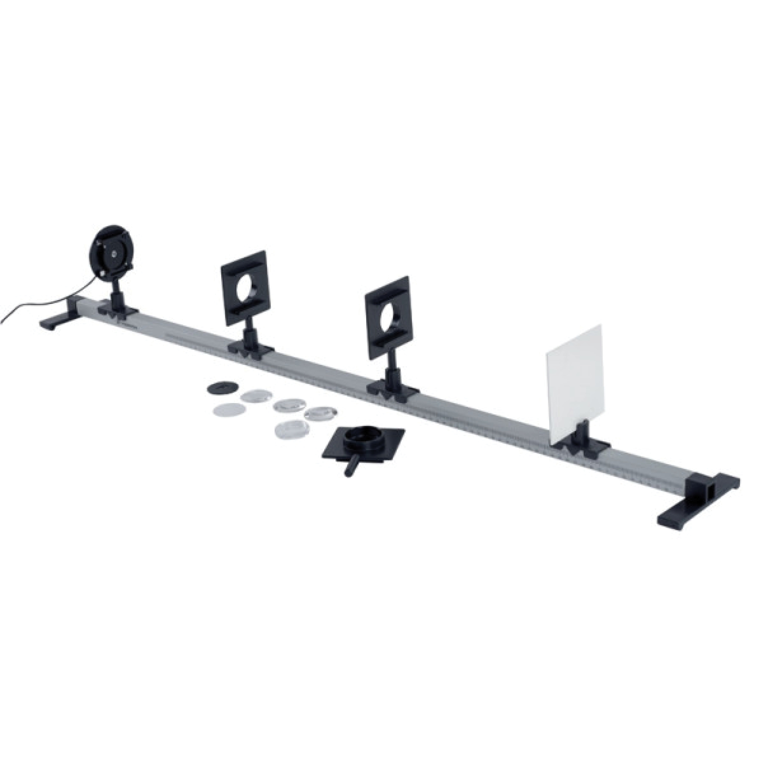 Grâce à ses deux pieds, le banc est parfaitement stable. Le positionnement des cavaliers est aisé. Les graduations bien visibles vous permettent de repérer parfaitement la position de chaque accessoire. Les deux porte-lentilles sont adaptés aux lentilles de Ø 40 mm. Chacun d’eux peut même accepter deux lentilles. C’est un véritable atout pour l’étude des défauts de l’œil et de ses corrections. Un porte-lentille / porte-filtre, livré dans l’ensemble, vous permettra d’utiliser vos filtres colorés pour traiter par exemple la synthèse additive des couleurs.