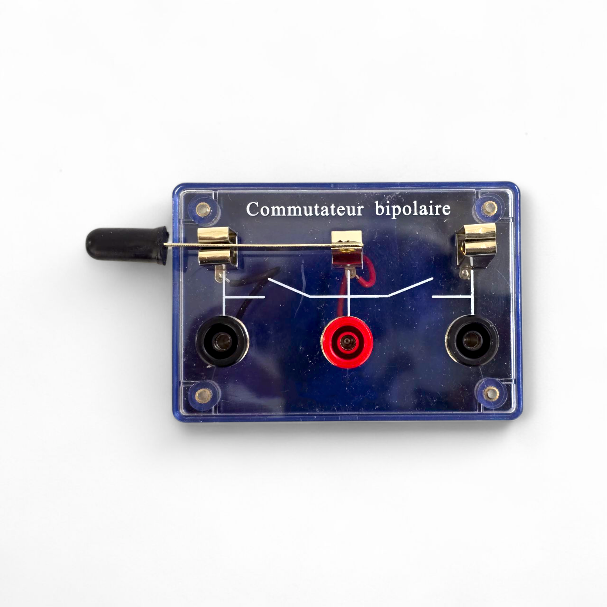 Commutateur Bipolaire monté sur un boîtier isolant. Les connexions électriques sont réalisées par l’intermédiaire de douilles de raccordement double puits.