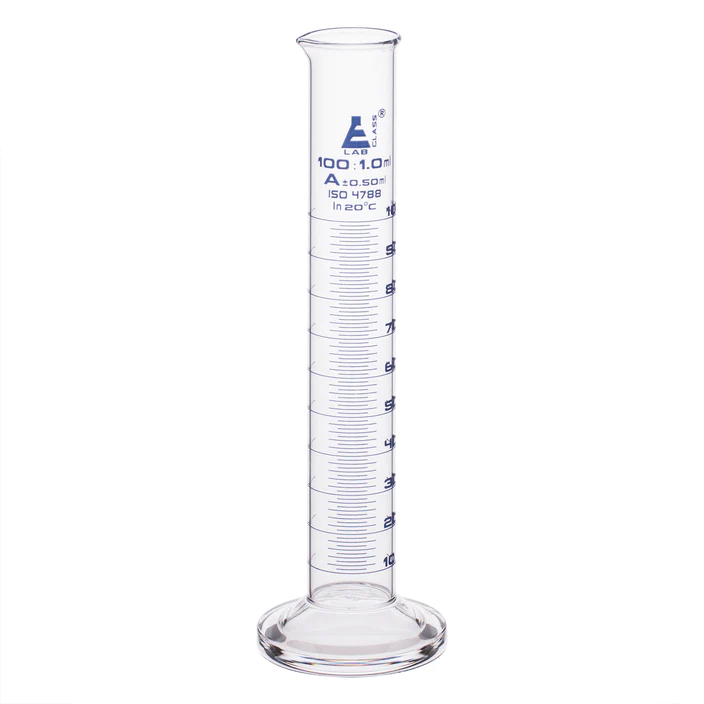 Éprouvette graduée de 100 ml en verre borosilicaté 3.3 de haute qualité et très résistant. Bec pour verser facilement et base ronde pour plus de stabilité. Tolérance de classe A, ± 0,50 ml selon la norme DIN EN ISO 4788. Graduations et spécifications imprimées en bleu. Subdivisions de 1 ml. Le cylindre mesure 9,5″ de haut, avec une base mesurant 2,6″ de large. Le diamètre intérieur du corps du cylindre mesure 29 mm (1,1″) et le diamètre extérieur mesure 35 mm (1,4″).