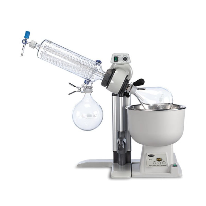 Condenseur à serpentin diagonal, Tube vapeur du condenseur, Ballon de collecte de 1L, Ballon florentin de 1L, Tube d’alimentation avec robinet d’arrêt, Système d’étanchéité au vide, Pince de joint conique, Pince de joint sphérique.