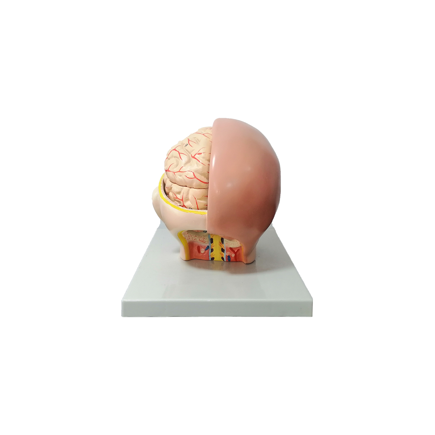 La tête grandeur nature en 6 parties est amovible, montée sur un support et comprend une demi-encéphale amovible en 4 parties avec artères.