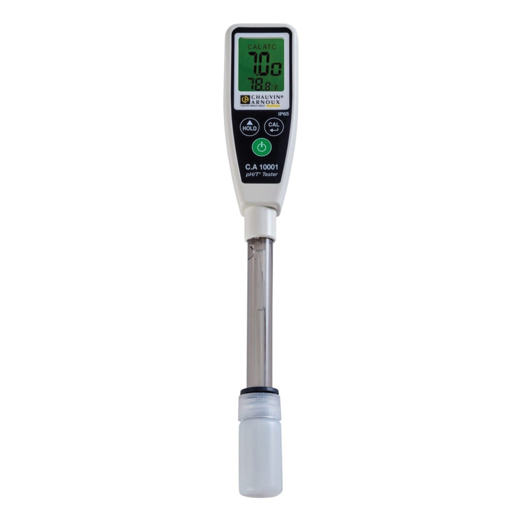 Le pH meter portable CA 10001 se présente sous la forme d’un stylo équipé à une extrémité d’une électrode combinée de 12 cm de long avec un capteur de température intégré. Le large écran multiparamètres affiche simultanément les valeurs de pH et de température (°C ou °F).