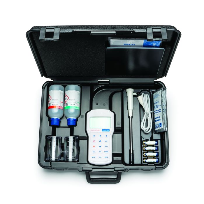 | Informations sur les commandes | HI98165 est fourni avec l’électrode de pH à corps PVDF FC2423, la solution tampon HI7004M pH 4.01 (230 mL), la solution tampon HI7007M pH 7.01 (230 mL), le sachet de solution de nettoyage d’électrode pour les résidus de fromage HI700642 (2), le bécher en plastique de 100 mL (2), les piles AA de 1,5 V (4), le logiciel HI92000 pour PC, le câble micro USB HI920015, le manuel d’instructions avec guide de démarrage rapide, le certificat de qualité de l’instrument et la mallette de transport rigide HI720165. |