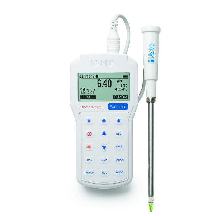 En plus de recevoir une électrode de pH unique pour le fromage, le HI98165 est doté de la fonction unique CAL Check ™ de Hanna, qui avertit l’utilisateur des problèmes potentiels au cours du processus d’étalonnage. Ceci est très important pour le transformateur car il est probable que la sonde sera recouverte des solides présents dans le produit alimentaire mesuré. Ce revêtement peut facilement entraîner des erreurs dans la mesure du pH. En comparant les données d’étalonnage précédentes à l’étalonnage en cours, le lecteur informera l’utilisateur, par des messages à l’écran, lorsque la sonde doit être nettoyée, remplacée ou si le tampon de pH peut être contaminé. Après l’étalonnage, la condition globale de la sonde est affichée à l’écran sous forme de pourcentage compris entre 0 et 100% par incréments de 10%. La condition de la sonde est affectée à la fois par les caractéristiques de décalage et de pente de l’électrode de pH, que l’on peut trouver dans les données BPL.