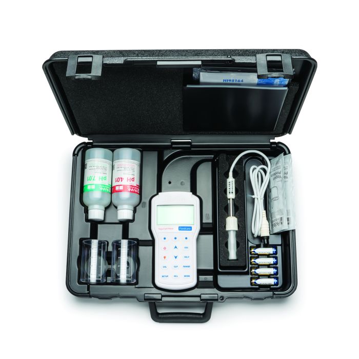 Le HI98164 est un pH-mètre portable robuste et étanche Foodcare qui mesure le pH et la température à l’aide de l’électrode de pH FC2133 pour yaourts. Cet instrument professionnel et étanche est conforme aux normes IP67. Le HI98164 est fourni avec tous les accessoires nécessaires pour effectuer une mesure de pH / température dans une mallette de transport thermoformé durable qui maintient les compteurs, les sondes et les tampons d’étalonnage en place.