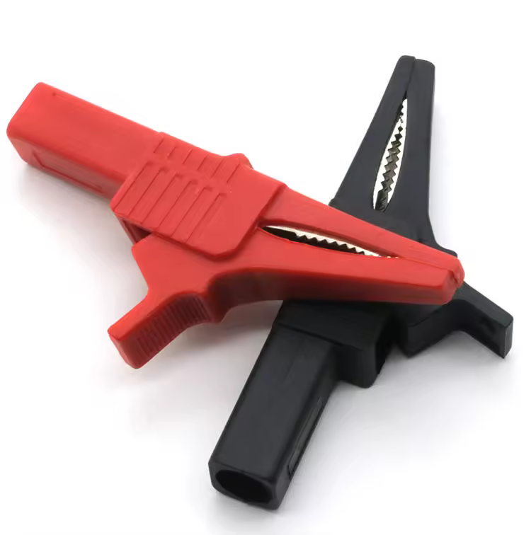 La Pince Crocodile protégée 85 mm (grande taille) est une solution robuste pour les travaux nécessitant une connexion fiable jusqu’à 32 ampères et 1000 volts. Elle possède une prise jack 4 mm à l’arrière, ce qui interdit toute soudure directe : pour le raccordement, il faut obligatoirement passer par une fiche banane.