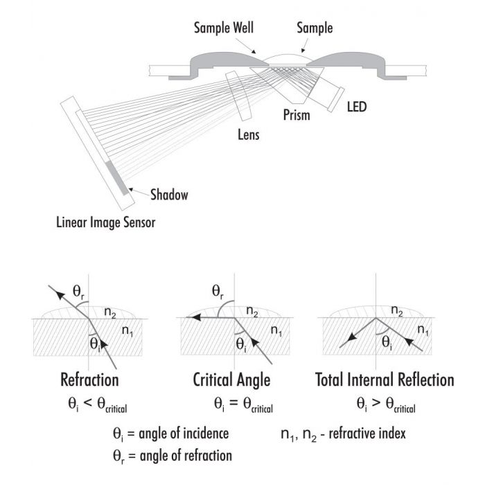 Le HI96801 prend des mesures en fonction de l’indice de réfraction de l’échantillon. L’indice de réfraction est une mesure du comportement de la lumière lorsqu’elle traverse l’échantillon. Selon la composition de l’échantillon, la lumière se réfractera et se réfléchira différemment. En mesurant cette activité avec un capteur d’image linéaire, l’indice de réfraction de l’échantillon peut être évalué et utilisé pour déterminer ses propriétés physiques telles que la concentration et la densité. En plus du capteur d’image linéaire, le HI96801 utilise une lumière LED, un prisme et une lentille pour permettre la mesure.