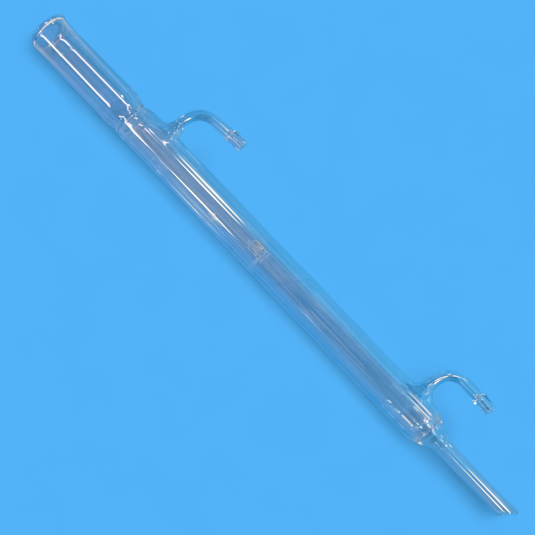 Ce réfrigérant droit type Liebig possède également un tube intérieur rectiligne, mais ses embouts d’entrée et de sortie d’eau sont placés sur des côtés opposés (un en haut, un en bas).