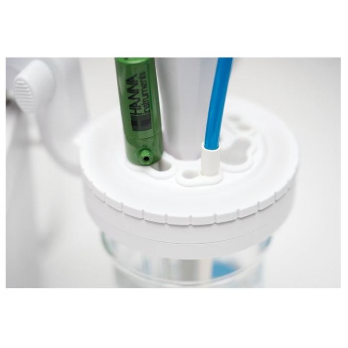 Ce porte-électrode peut contenir jusqu’à 3 électrodes, 4 tubes et 1 sonde de température. Le support est incliné pour concentrer les sondes au centre pour les tailles de bécher plus petites. Utilisez des électrodes de diamètres différents si nécessaire en changeant le guide d’électrode.